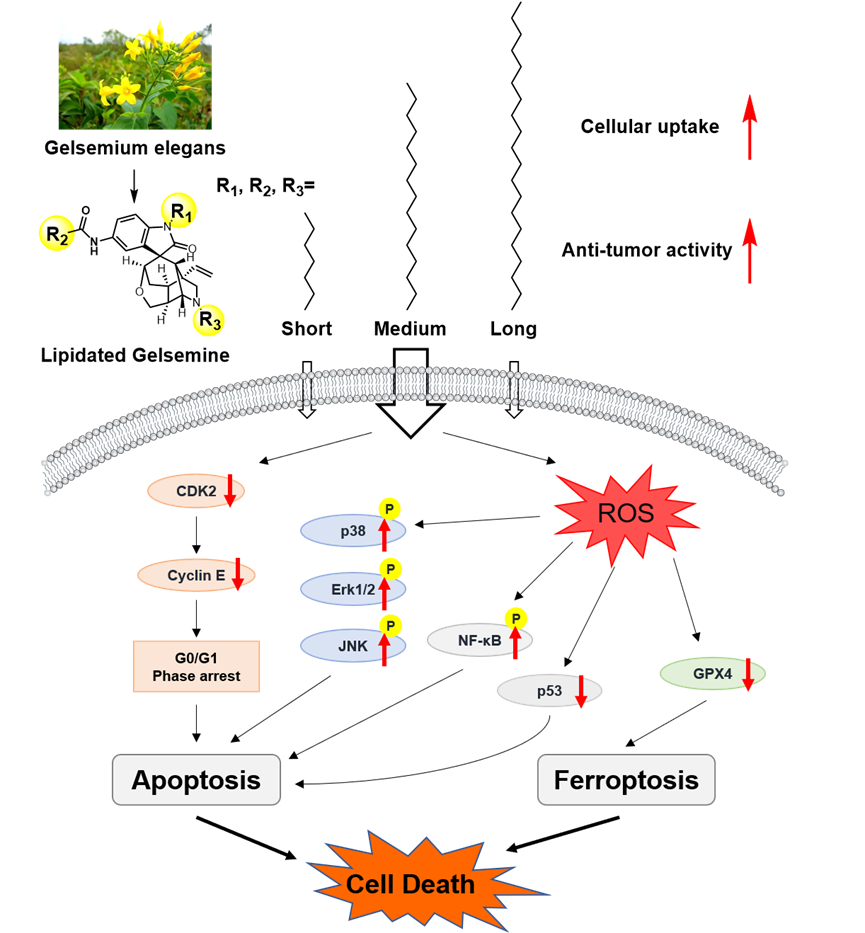 许多天然产物或药物分子中经常带有中等长度的脂肪链,它对化合物的细胞渗透性和生物利用度起着非常重要的作用。基于改善钩吻素甲理化性质考虑,中药新药研究组发展了多种钩吻素甲衍生化方法,并在不同位点分别引入了短、中、长脂肪链取代基,得到3个系列的钩吻素甲脂化衍生物GA、GB和GC。在多种人肿瘤细胞株上(HT-29、Hela、HepG2、HCT-15),大部分化合物都显示出优于钩吻素甲的抗增殖活性,且其IC50值与脂链长度密切相关,中等长度脂质链增强效果最为显著。例如,带有15烷基的GB5在结肠癌细胞系HT-29上,IC50低至0.48 μM,相较钩吻素甲提高了近千倍,并且相对人正常肠上皮细胞株NCM-460,显示出12.5倍的选择性。细胞荧光实验结果表明脂链修饰显著提高钩吻素甲衍生物的细胞渗透性,并最终定位在溶酶体中。进一步药理实验表明,代表性化合物GA6和GB5能将HT-29细胞周期阻滞在G0/G1期,并显著提高细胞中的ROS水平。过量的ROS不仅能诱导细胞铁死亡,而且能同时激活MAPK/NF-κB/p53信号通路,促进HT-29细胞凋亡。荷瘤裸鼠模型实验结果表明GA6和GB5具有与一线抗癌药5-FU相当的体内抗癌活性,是一种有前景的抗结直肠癌治疗候选药物。该项目相关成果已发表于Bioorganic Chemistry,并申请了发明专利(申请号:2024117322716)。