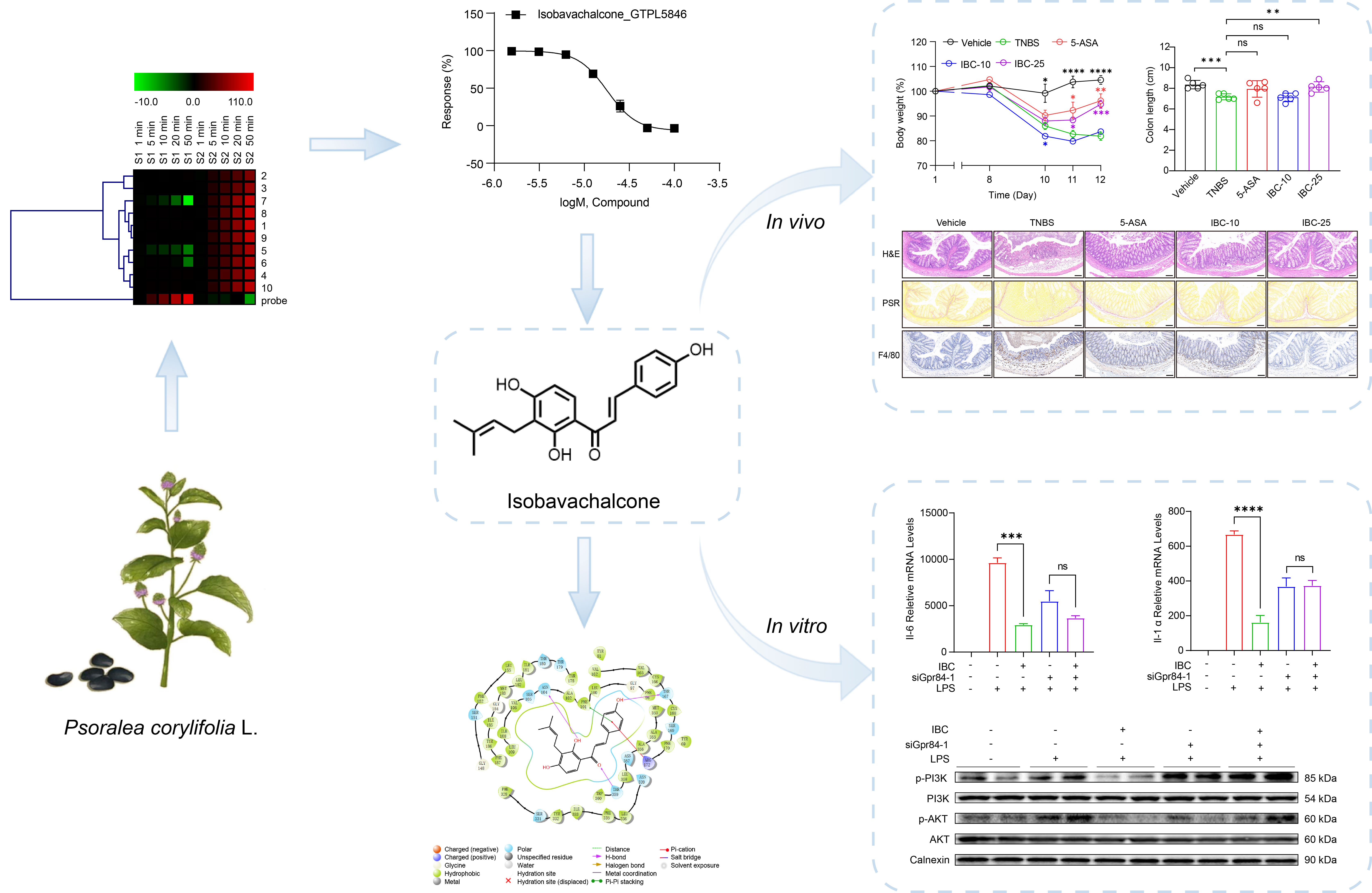 针对补骨脂抗IBD靶效成分不清楚的科学问题,中药活性筛选与评价研究组利用动态质量重置技术建立了GPR84的高通量筛选模型,对补骨脂中10种主要成分进行筛选,发现补骨脂乙素(Isobavachalcone)为一种新型GPR84拮抗剂。结合计算模拟,发现补骨脂乙素通过π-π堆积、π-阳离子作用和氢键作用与GPR84稳定结合。在脂多糖诱导的RAW264.7巨噬细胞炎症模型中,补骨脂乙素显著抑制炎症因子Il-6、Il-1α、Il-1β、Ccl2及NO的释放。在2,4,6-三硝基苯磺酸诱导的克罗恩病样小鼠结肠炎模型中,补骨脂乙素剂量依赖性地缓解体重下降、结肠缩短、结肠组织损伤和巨噬细胞浸润,并恢复肠道屏障完整性,下调促炎因子Tnf-α、Il-6、Il-1α、Il-1β、Il-23、Ifn-γ和Il-17的表达。通过转录组测序及Western blot分析,发现补骨脂乙素显著抑制PI3K和AKT的磷酸化,而siRNA敲低GPR84会减弱其抗炎作用,说明补骨脂乙素通过抑制GPR84-PI3K-AKT信号轴发挥抗炎作用。本研究首次揭示补骨脂中补骨脂乙素通过拮抗GPR84并抑制下游PI3K-AKT通路发挥抗克罗恩病样结肠炎的作用。